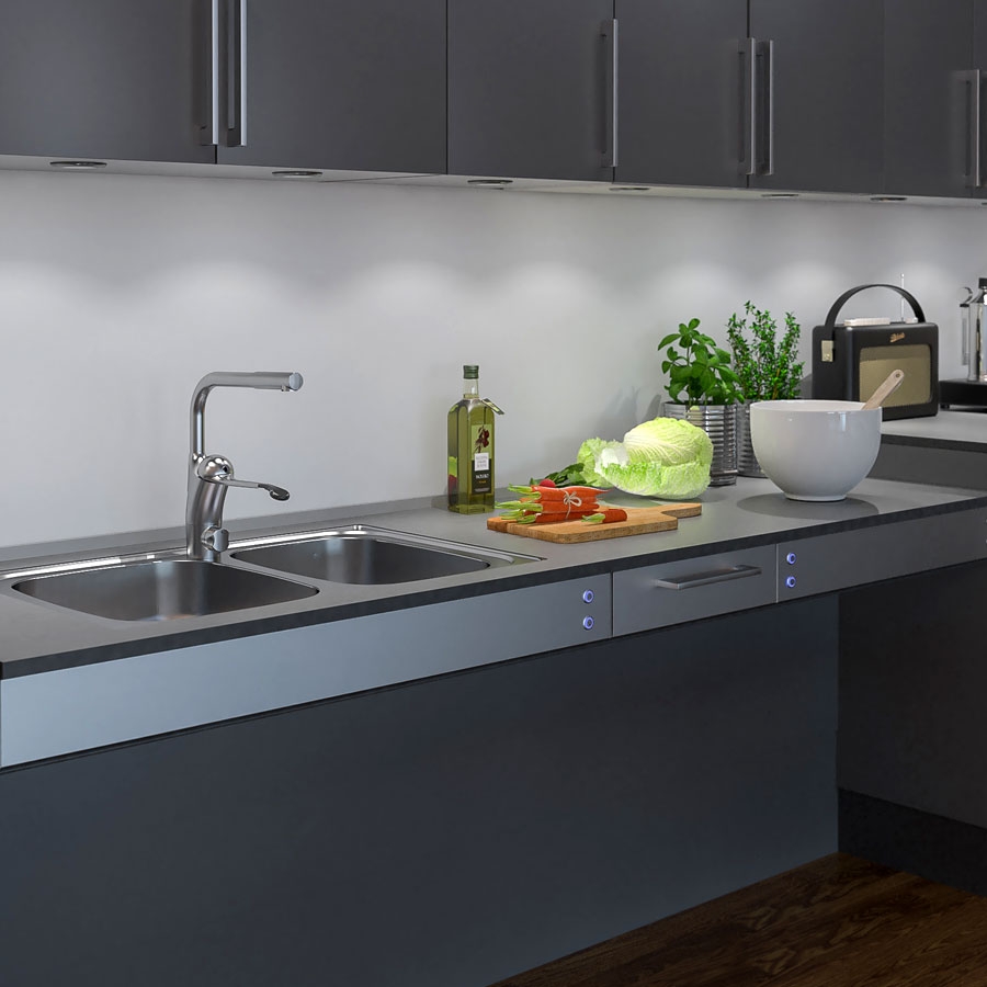 Sotto il piano di lavoro c'è spazio a sufficienza per le ginocchia e le gambe. Le installazioni sotto il piano di lavoro (motori, collegamento idrico, scarico), possono essere nascoste mediante pannelli di copertura telescopici che conferiscono alla cucina un aspetto ordinato.